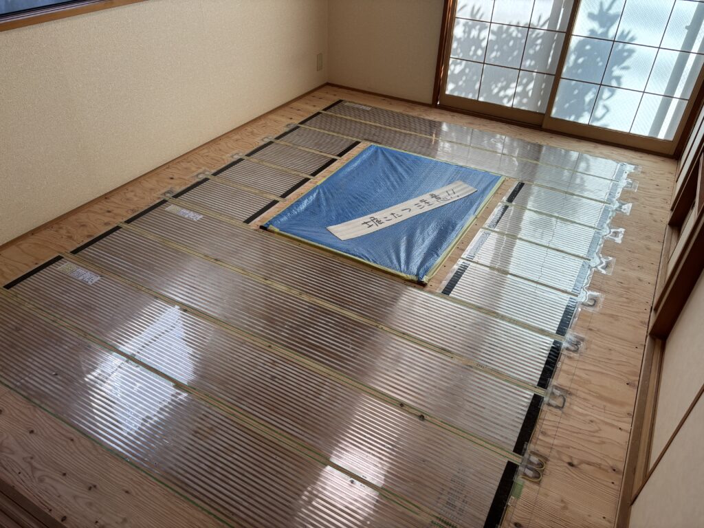 こちらのお客様は和室のままをご希望でしたので、新規で床暖房対応の薄畳を採用しております。フローリングに仕上げる場合も、断熱材の敷設は必須となります。床暖房はScut Systemさんの商品を採用させていただきました。