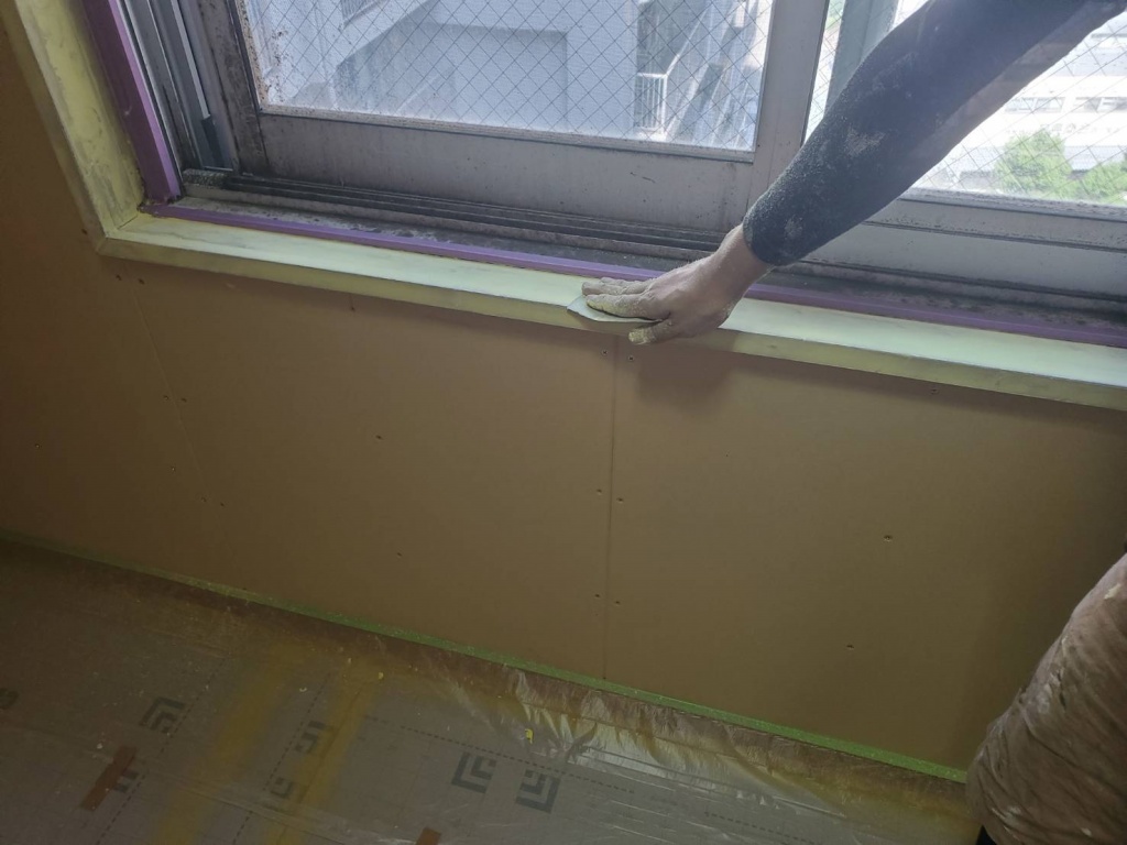 ②ビス頭部分およびボードの継ぎ目にパテを打ちまして凹み部分を埋めていきます。