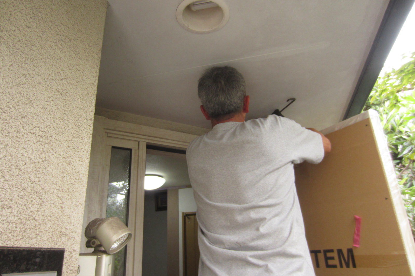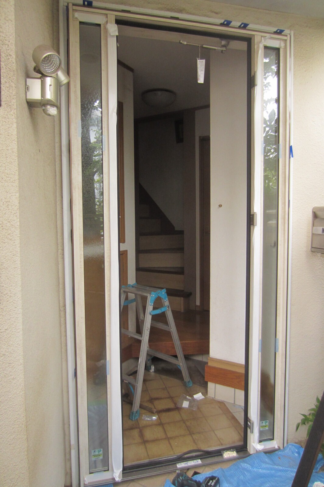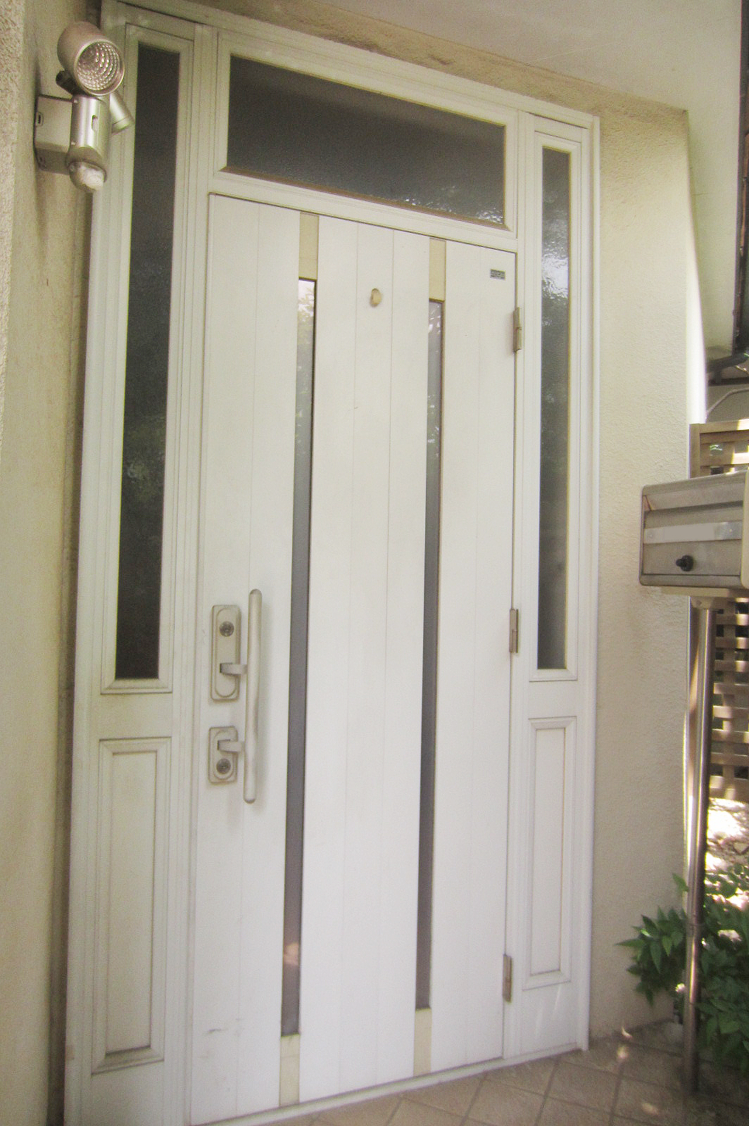 掃除をしていたらドアの上にある欄間がグラグラするのに気がついたM様。欄間のガラスが落ちてきたらたいへんと玄関ドアの交換に踏み切りました。M様邸のドアは両側に袖があるちょっとめずらしい形ですが、このLIXIL リシェントはいろいろな開きのバージョンがあるので、こんなめずらしいドアにも対応ができます。このLIXIL リシェントなら外壁を壊さず1日でリフォーム完了。その秘密の方法は『カバー工法』。