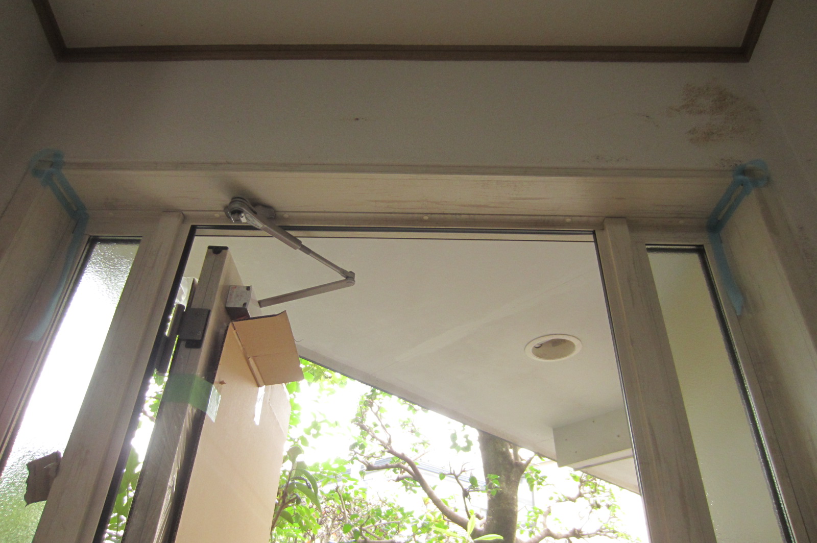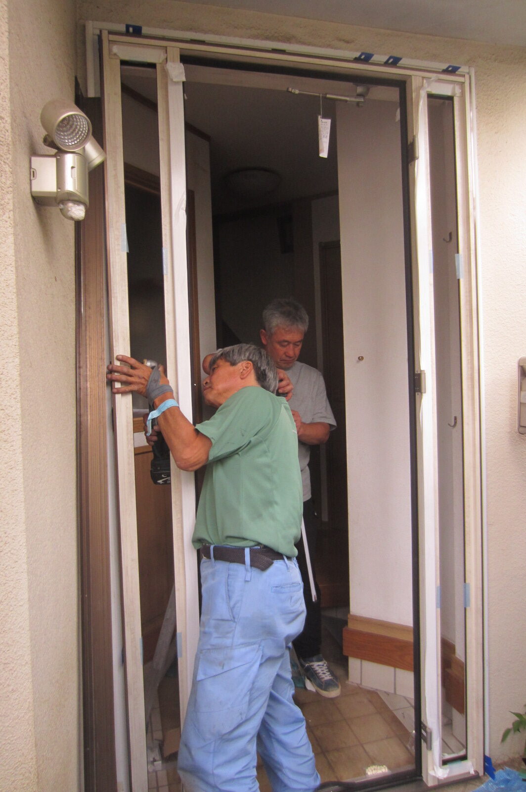 工事はまず、既存の扉を外します。既存の枠の上に新しい枠を水平・垂直を合わせながら取り付けます。枠の取付が完了したら、新しい扉を吊り込みます。
