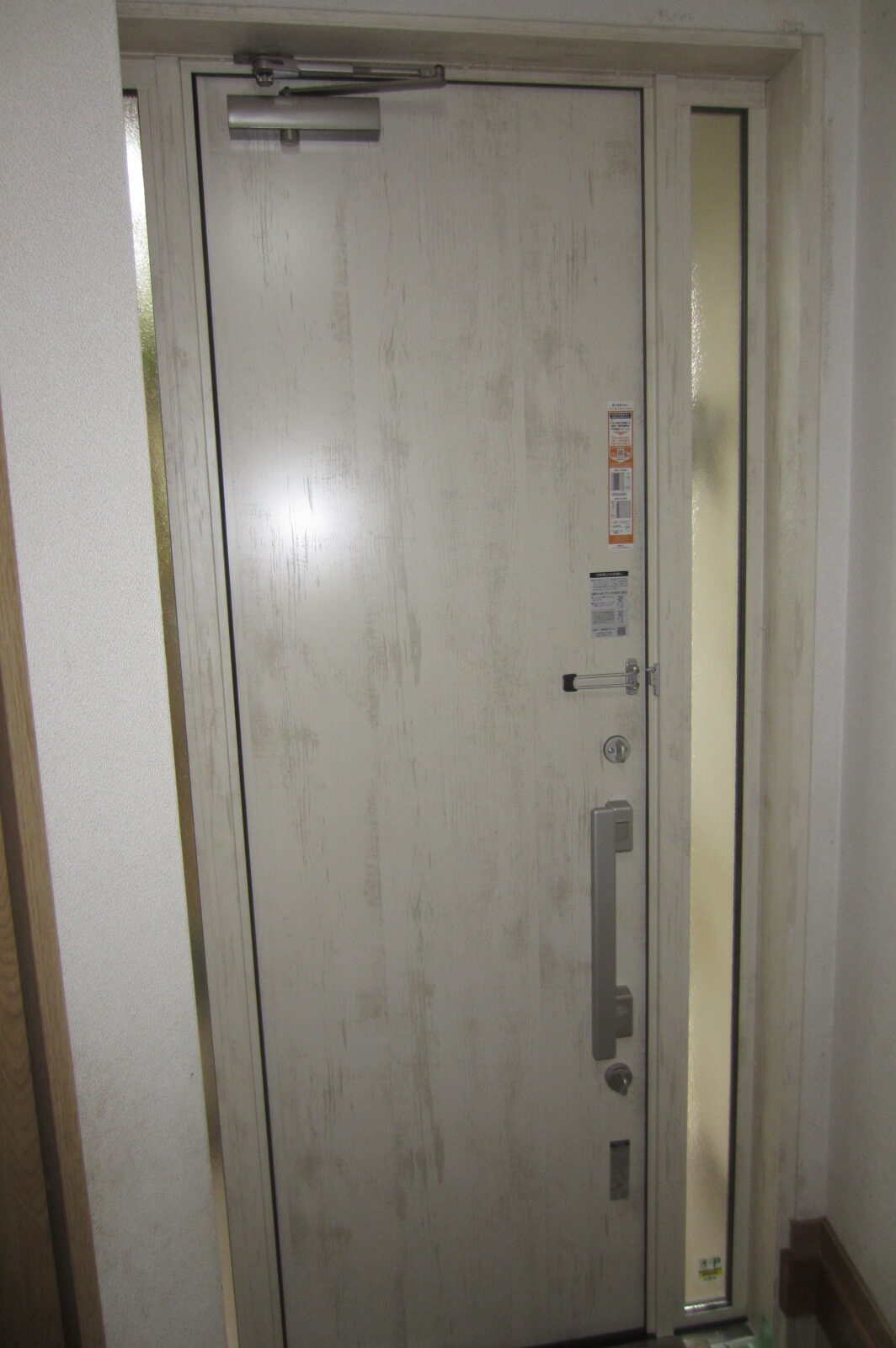 最後に内部の枠廻りに新しい額縁を取付て完成です。この工事でかかった作業時間は5時間半でした。断熱や防犯性にお悩みの方、玄関ドアのリフォームで住まいの印象を大きく変えてみませんか。