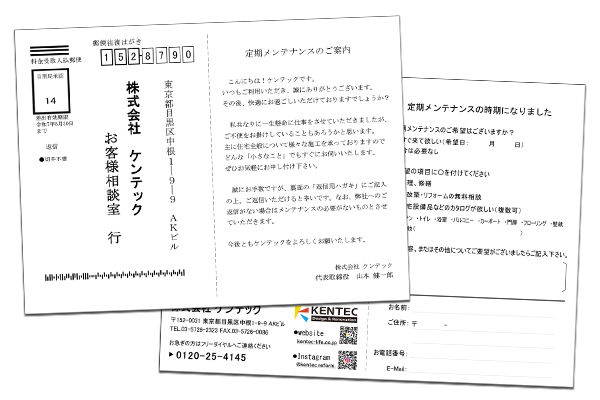 アフターメンテナンスの往復はがきを送らせていただきますので、