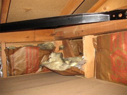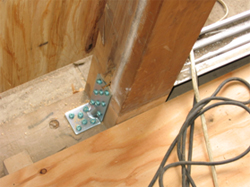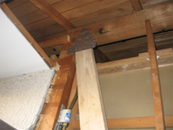 屋根裏で補強金物の取り付け、筋交いを確認しています。 (金物に取付けボルトが有りません。)
