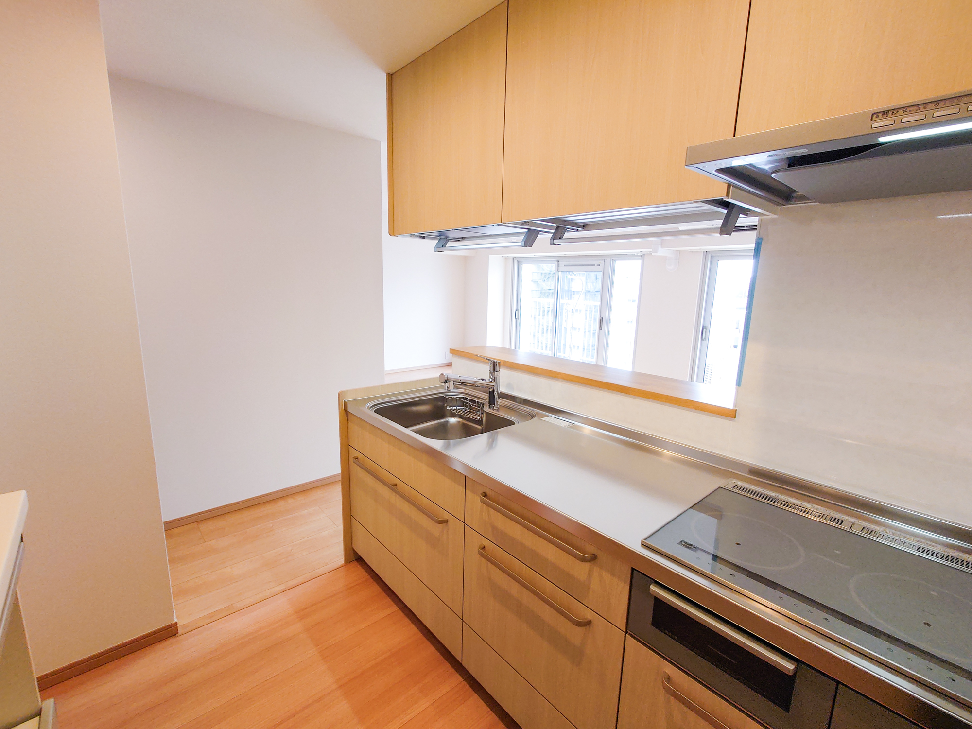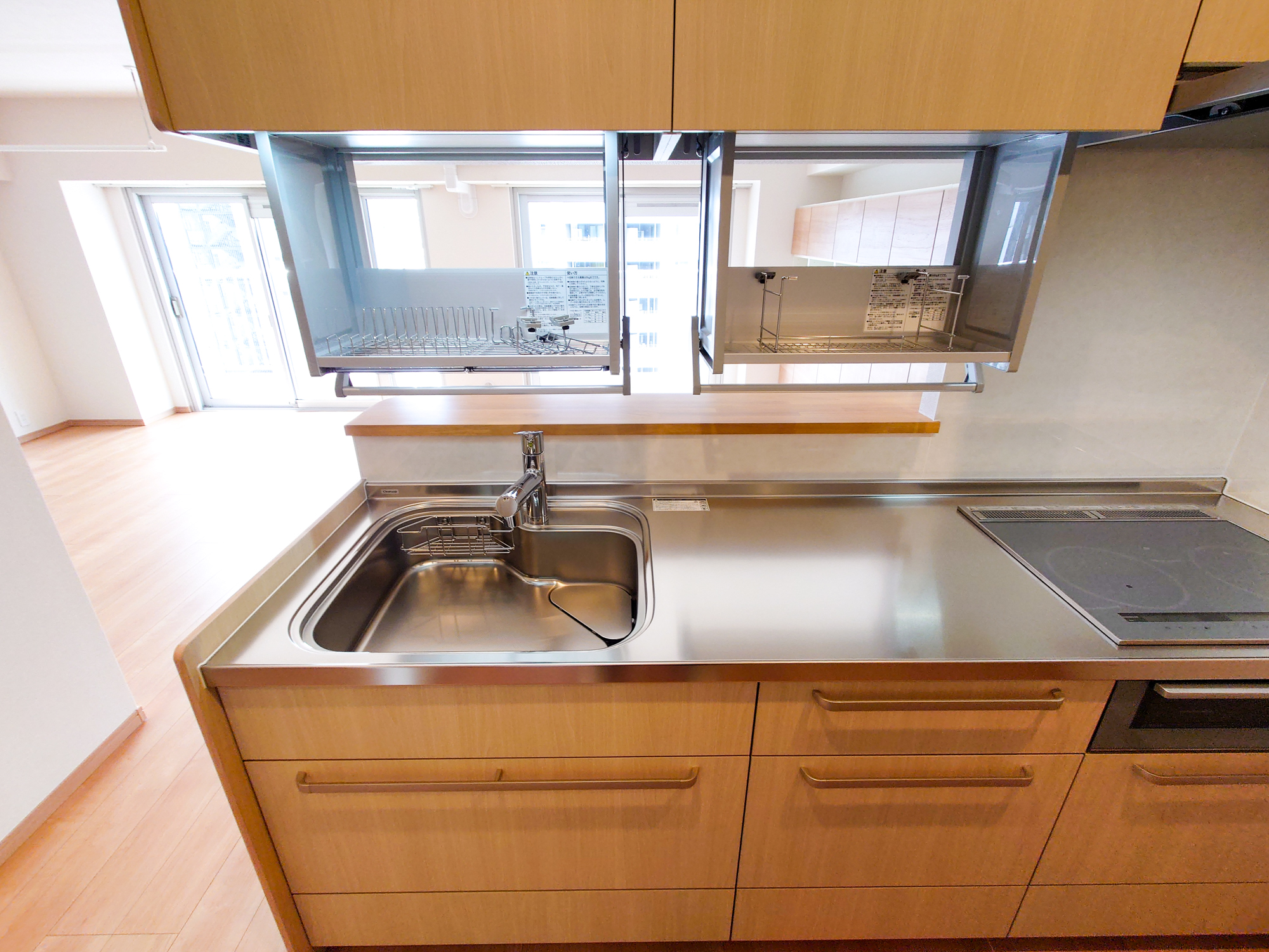 優しい色合いの木目にステンレスのワークトップを合わせることで、
