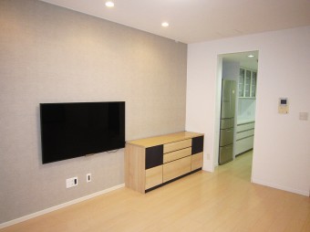 エコカラットにダウンライトが映えるリビング。 テレビを壁付けにしました。