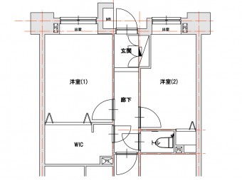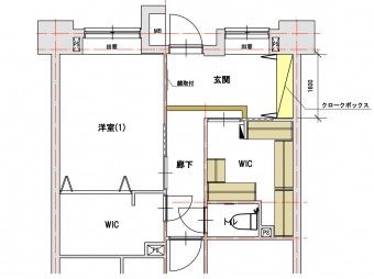 洋室だったスペースを、自転車もおける広い玄関とクロークボックス、ウォークインクローゼットにリフォームしました。(上記図面参照)
