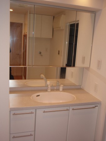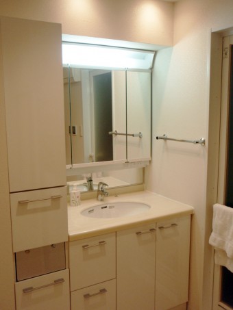 洗面化粧台は幅を狭くして収納を充実させてる仕上げをさせて頂きました。