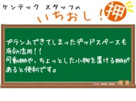 玄関収納を洋室側へ埋め込んで、できるだけ玄関スペースを広く確保。浴室側にできたデットスペースを利用して、ちょっとした棚も設置しました。